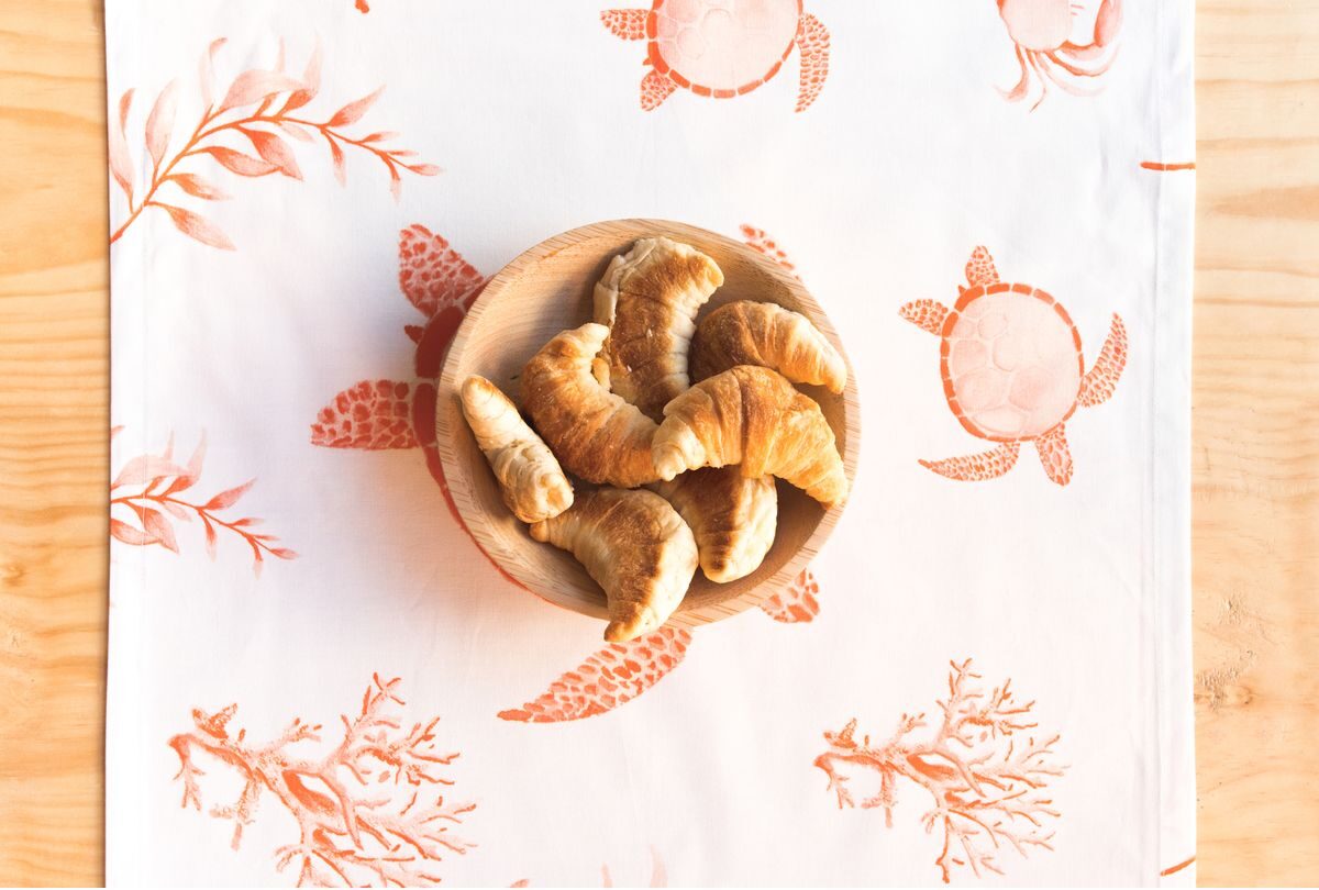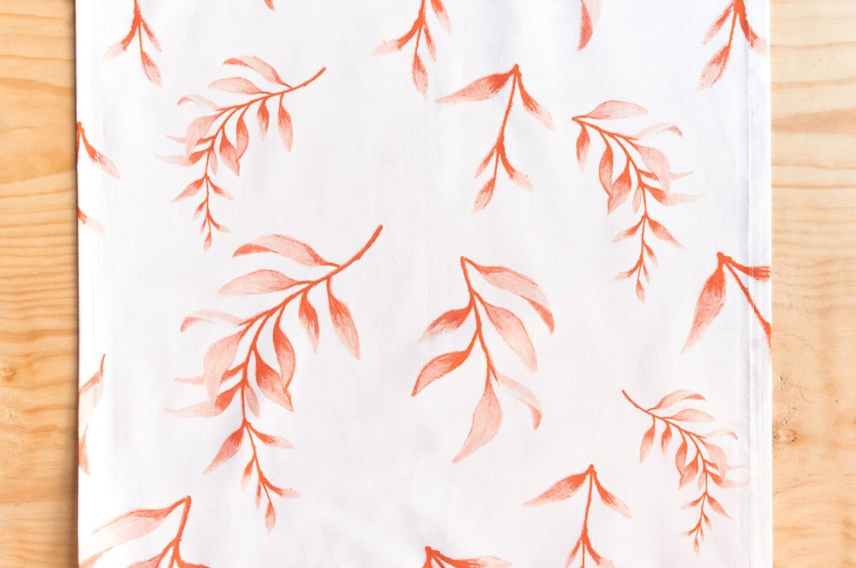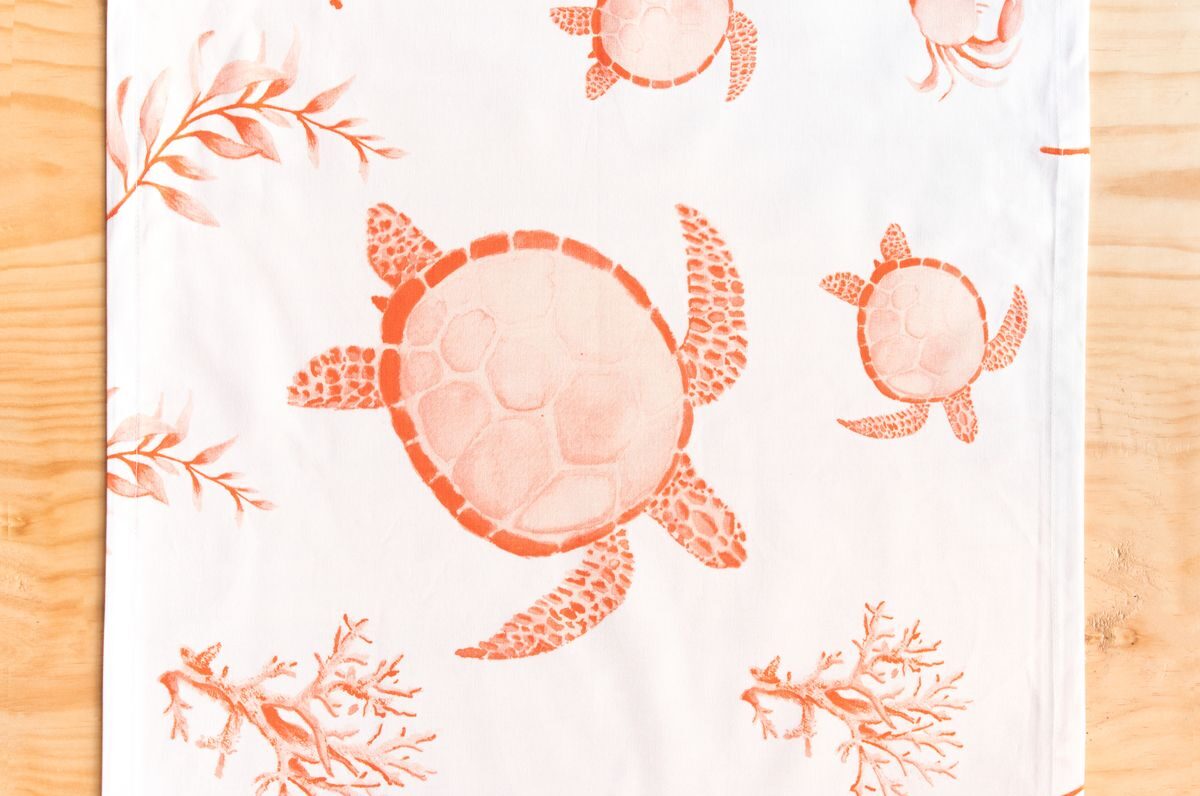 Camino de mesa para mesa de 4 puestos confeccionado en tela de algodón que presenta estampados únicos inspirados en la fauna y flora del Pacífico colombiano, con estampados marinos en color naranja. Cada detalle de este camino de mesa celebra la diversidad natural de Colombia, convirtiéndolo en una pieza única y encantadora para la mesa.