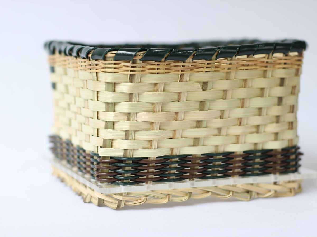 Canasta pequeña tejida en fibra natural con aplique tejido en plástico recuperado y base de acrílico transparente, elaboradas por artesanos de tejeduría de Duitama, Boyacá. Ideales para decorar los espacios de tu hogar.