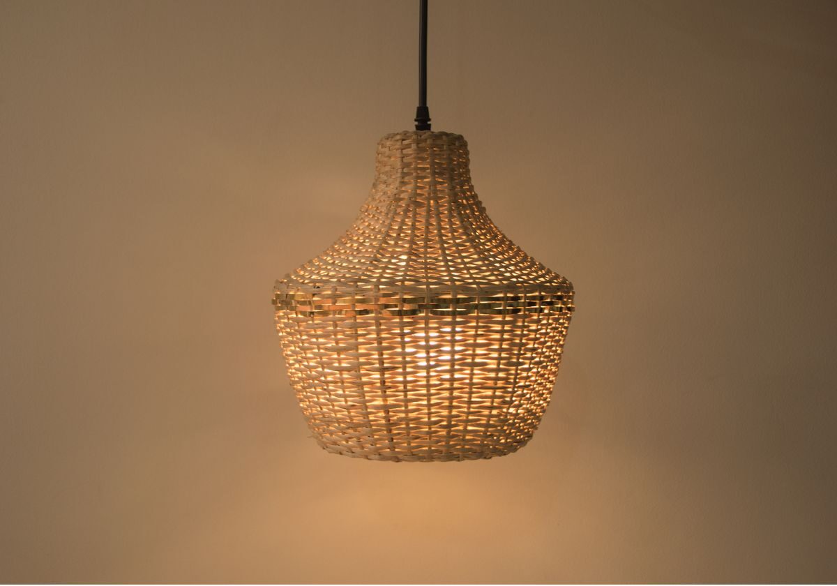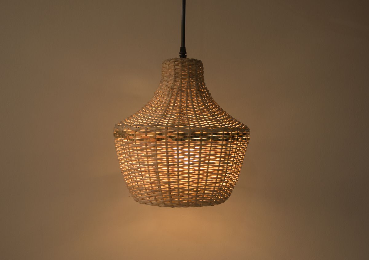 Lámpara de techo tejida en fibra natural, incluye cable con conexión y bombillo LED de luz amarilla.