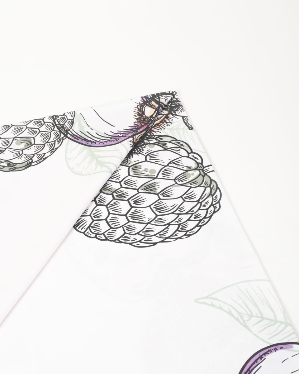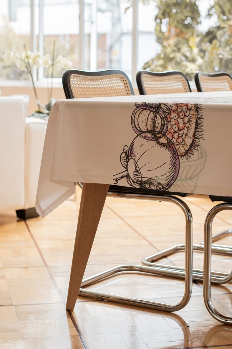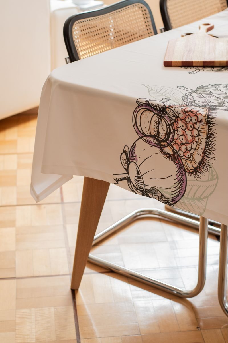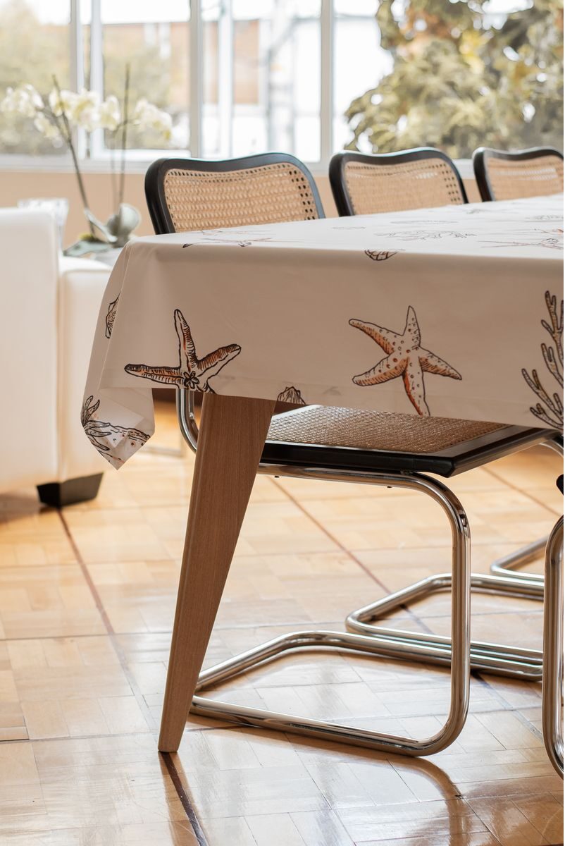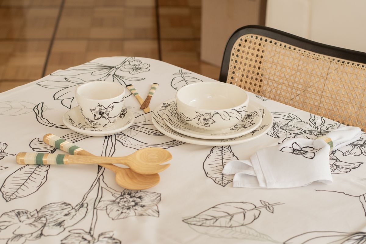 Mantel de 8 puestos confeccionado en tela de algodón que presenta tres estampados únicos inspirados en diversas regiones de Colombia. La primera sección, dedicada a la región caribe, exhibe vibrantes elementos marinos como corales, conchas y estrellas de mar, evocando la riqueza del océano. La segunda sección rinde homenaje a la región andina, con delicadas flores autóctonas como la flor de la papa, la orquídea y el totumo, reflejando la biodiversidad de las montañas. Finalmente, la tercera sección se inspira en la exuberante región amazónica, mostrando frutas exóticas como el mangostino, el achiote y el anón, que capturan la esencia de la selva tropical. Cada detalle de este mantel celebra la diversidad natural y cultural de Colombia, convirtiéndolo en una pieza única y encantadora para la mesa.