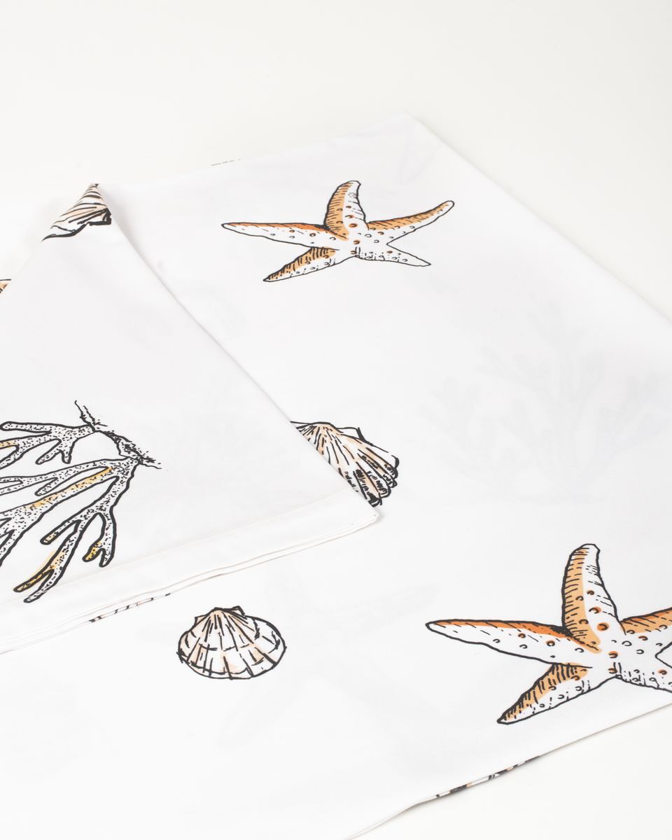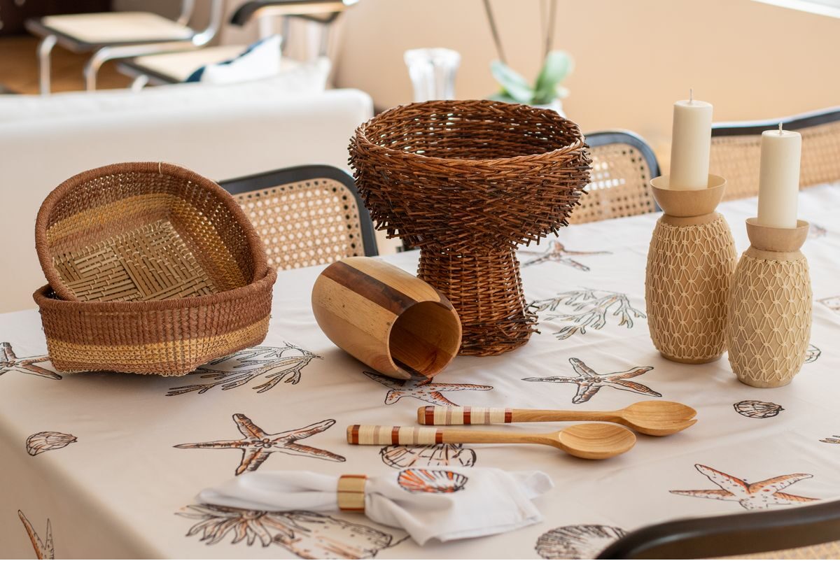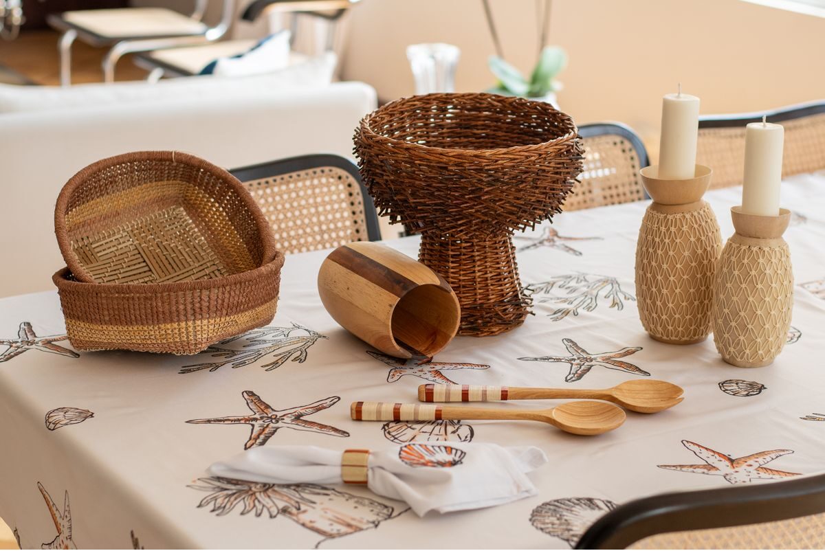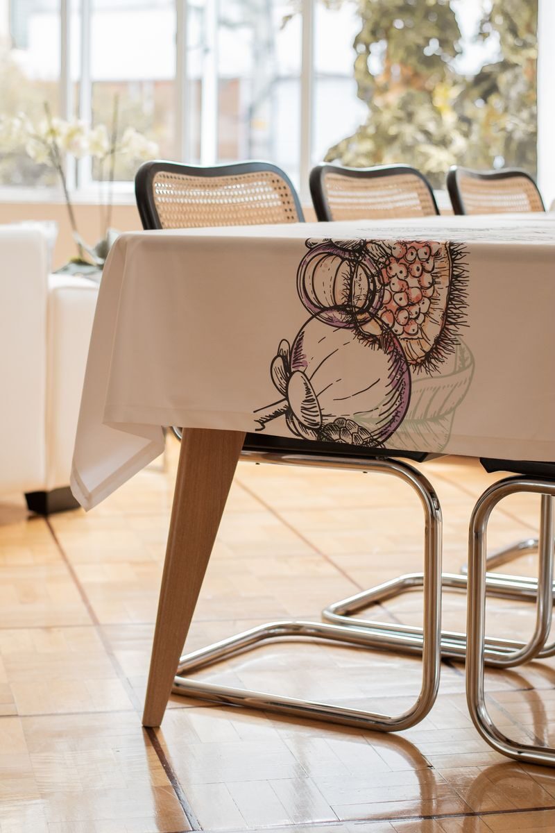 Mantel de 8 puestos confeccionado en tela de algodón que presenta tres estampados únicos inspirados en diversas regiones de Colombia. La primera sección, dedicada a la región caribe, exhibe vibrantes elementos marinos como corales, conchas y estrellas de mar, evocando la riqueza del océano. La segunda sección rinde homenaje a la región andina, con delicadas flores autóctonas como la flor de la papa, la orquídea y el totumo, reflejando la biodiversidad de las montañas. Finalmente, la tercera sección se inspira en la exuberante región amazónica, mostrando frutas exóticas como el mangostino, el achiote y el anón, que capturan la esencia de la selva tropical. Cada detalle de este mantel celebra la diversidad natural y cultural de Colombia, convirtiéndolo en una pieza única y encantadora para la mesa.