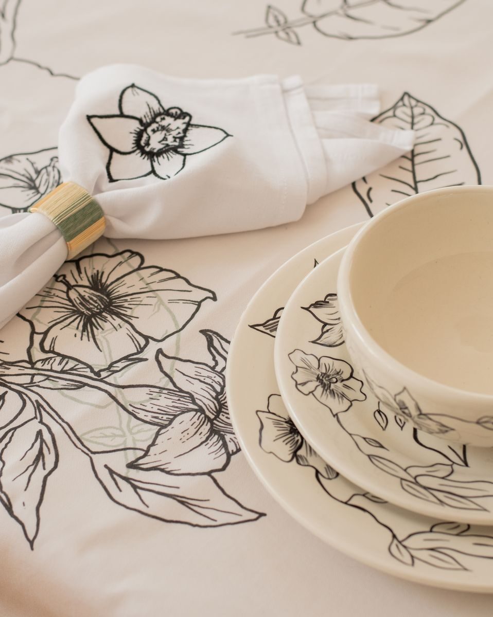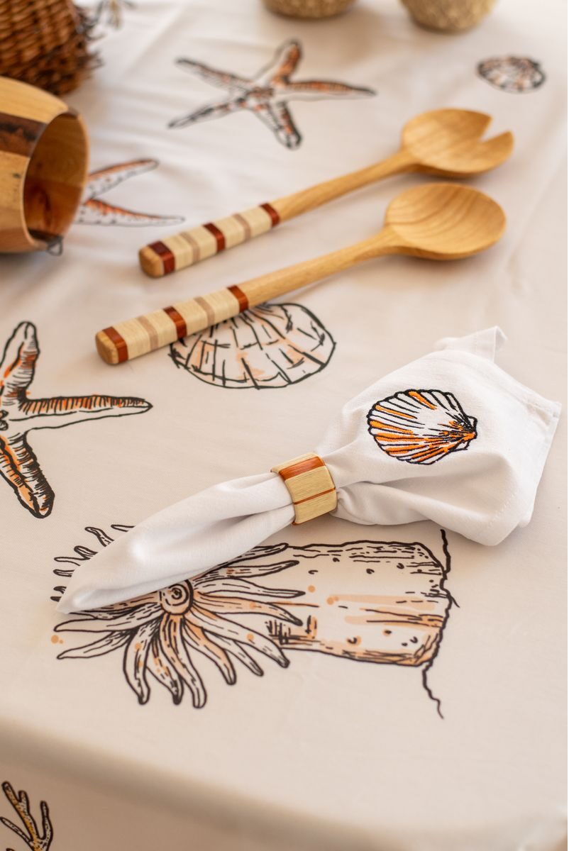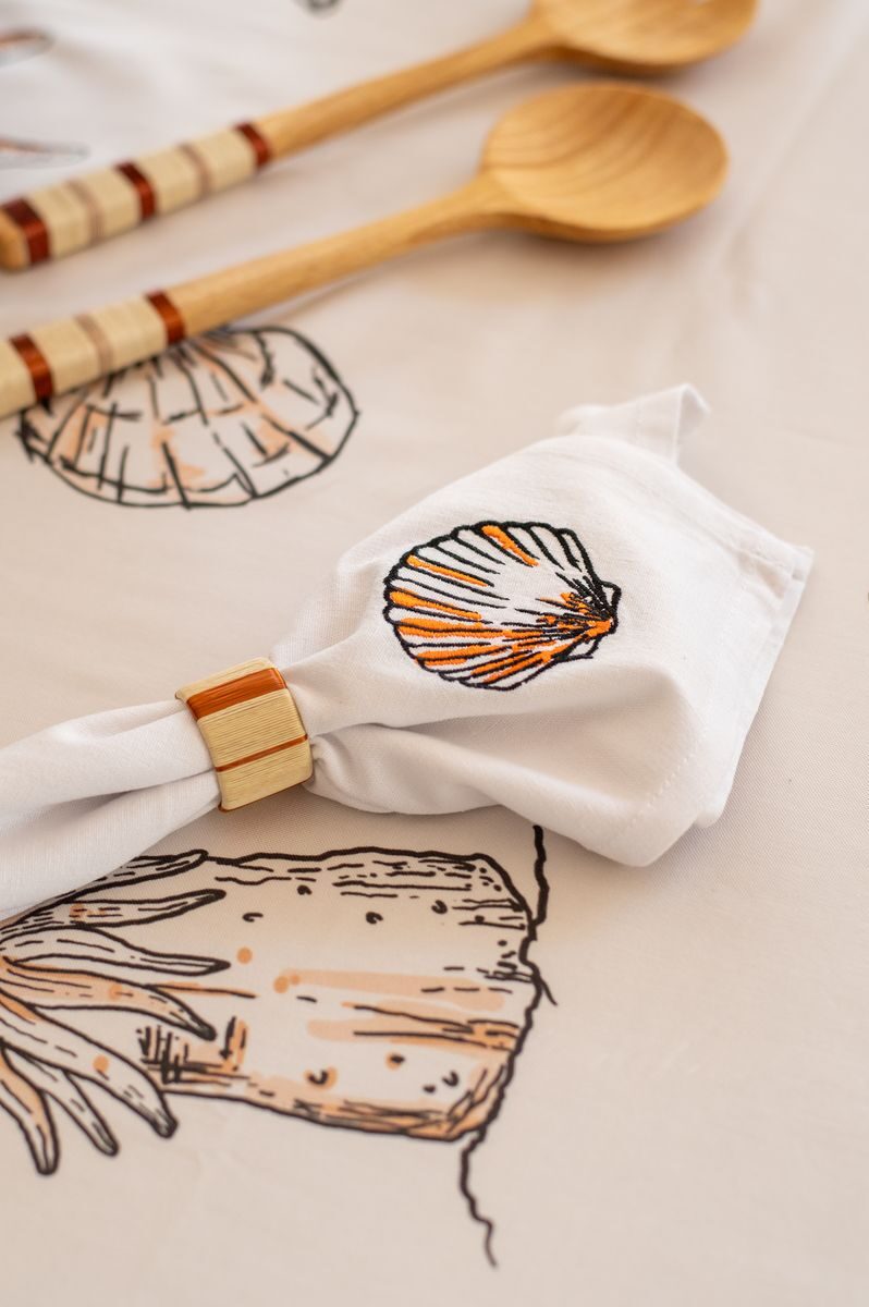 Estas servilletas de tela tienen bordados de estrella de mar, mangostino y flor de papa, combinando la elegancia natural con la practicidad diaria. Cada detalle refleja la frescura del océano y la tierra, agregando un toque distintivo a cualquier mesa.
